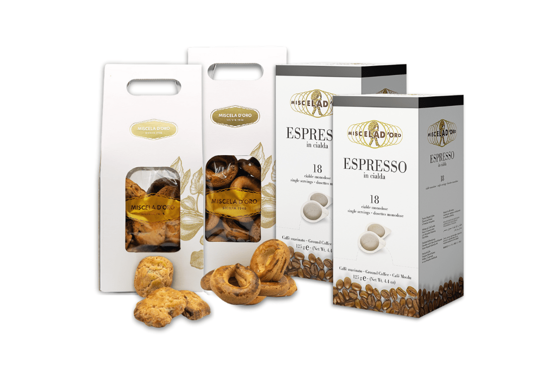 Commencez votre journée avec l’arôme et le plaisir du véritable espresso sicilien. Avec les dosettes Miscela d’Oro, préparez en quelques secondes un espresso crémeux et corsé — comme au café. Savourez-le accompagné de ciambelline sablées parfumées et des traditionnels biscuits siciliens aux amandes Nzuddi, pour un véritable goût de Sicile.
